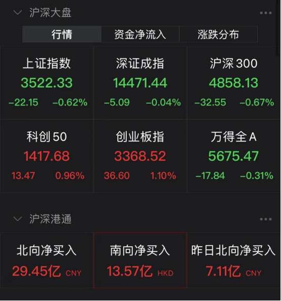 截至午間收盤(pán),上證指數(shù)下跌0.62%,深證成指下跌0.04%,創(chuàng)業(yè)板指上漲1.10%。兩市半日成交額超7500億元,其中滬市半日成交額為3506.05億元,深市半日成交額為4014.14億元。