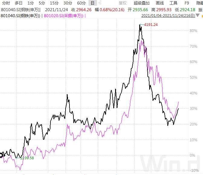 此外,去年表現(xiàn)平平的鋼鐵、采掘板塊,今年以來漲幅均超過30%且走勢幾乎趨同,年度最高漲幅一度超過70%,近期出現(xiàn)大回調(diào)后開始企穩(wěn)。得益于鋼鐵、煤炭、石油等價格的持續(xù)上漲,板塊內(nèi)公司業(yè)績快速釋放,近期相關(guān)商品價格雖然出現(xiàn)回調(diào),但仍處于歷史高位。