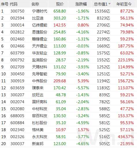 從鋰電池概念市值排名前20的公司來看,今年以來全線大漲,其中,寧德時代、比亞迪、億緯鋰能、【恩捷股份(002812)、股吧】、贛鋒鋰業(yè)、天齊鋰業(yè)、華友鈷業(yè)、鹽湖股份、天賜材料、先導(dǎo)智能、中偉股份、璞泰來等12家千億市值以上公司漲幅均超過50%,部分公司漲幅甚至超過100%。