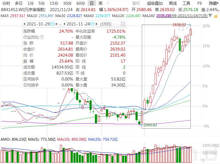 在新能源極致抱團的情況下,元宇宙吹起了虛擬世界的風(fēng)口,乘風(fēng)而上,在不足一個月的時間里,元宇宙板塊指數(shù)漲幅超過24%,而這也給很多長期滯漲的板塊的帶來了新機,如游戲、傳媒、硬件設(shè)備類個股。