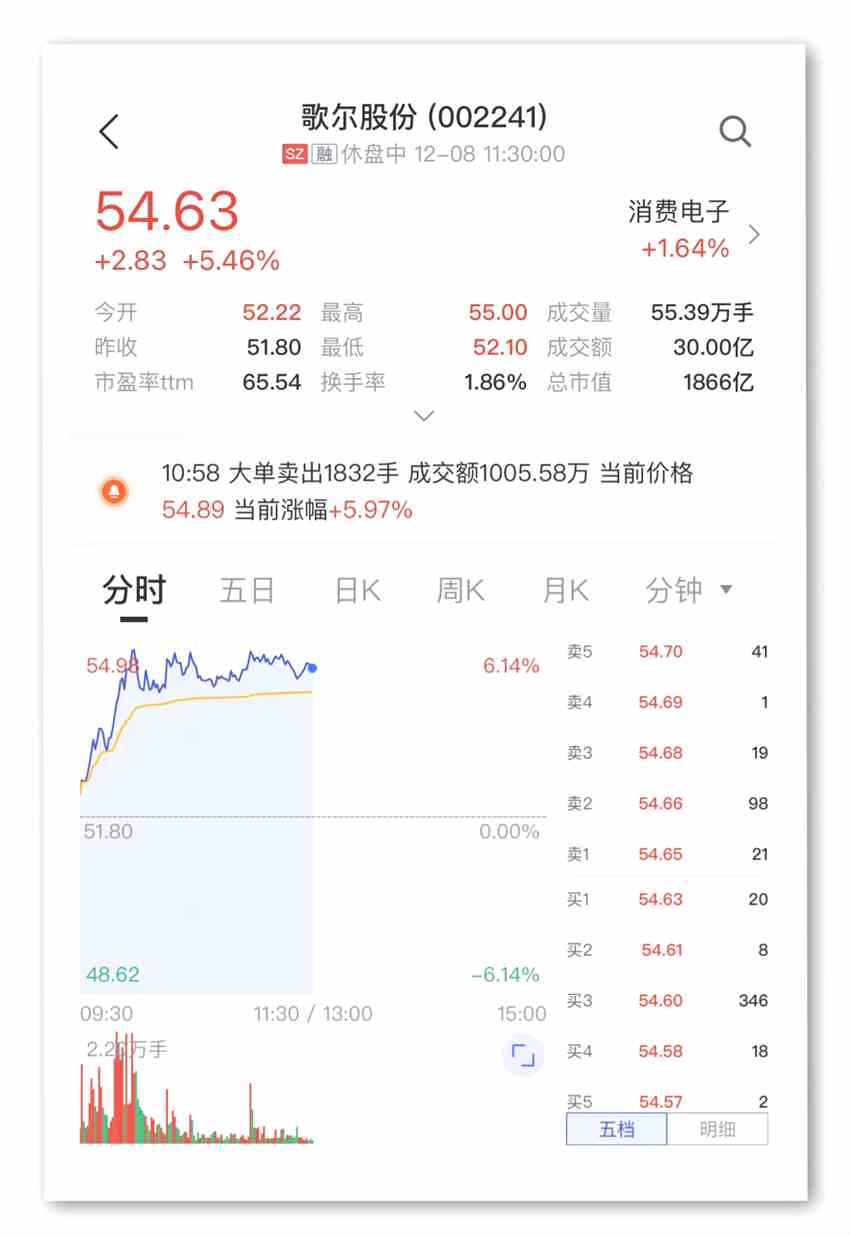 今日上午,蘋果產(chǎn)業(yè)鏈走勢活躍,其中歌爾股份上漲5.46%,總市值為1866億元,股價逼近歷史高點。