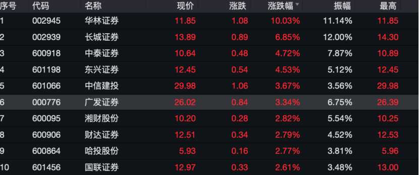 12月8日盤后,券商股再次體會到了市場熱情。華林證券在2點半左右直線拉漲,最終錄得漲停。在其帶動下,券商板塊整體上漲,長城證券漲超6%,中泰證券漲超4%,券商指數(shù)漲1.49%。