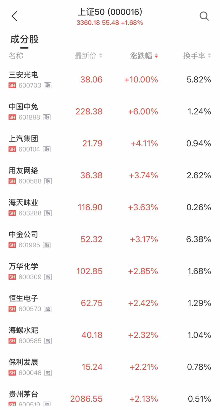 今日漲幅居前的行業(yè)板塊均為權(quán)重板塊。權(quán)重股集中的上證50指數(shù)走勢(shì)也強(qiáng)于大盤,上證50成分股中,僅有【航發(fā)動(dòng)力(600893)、股吧】、韋爾股份、兆易創(chuàng)新、興業(yè)銀行下跌,其他46只股票均上漲,三安光電漲停,中國(guó)中免上漲6.00%。