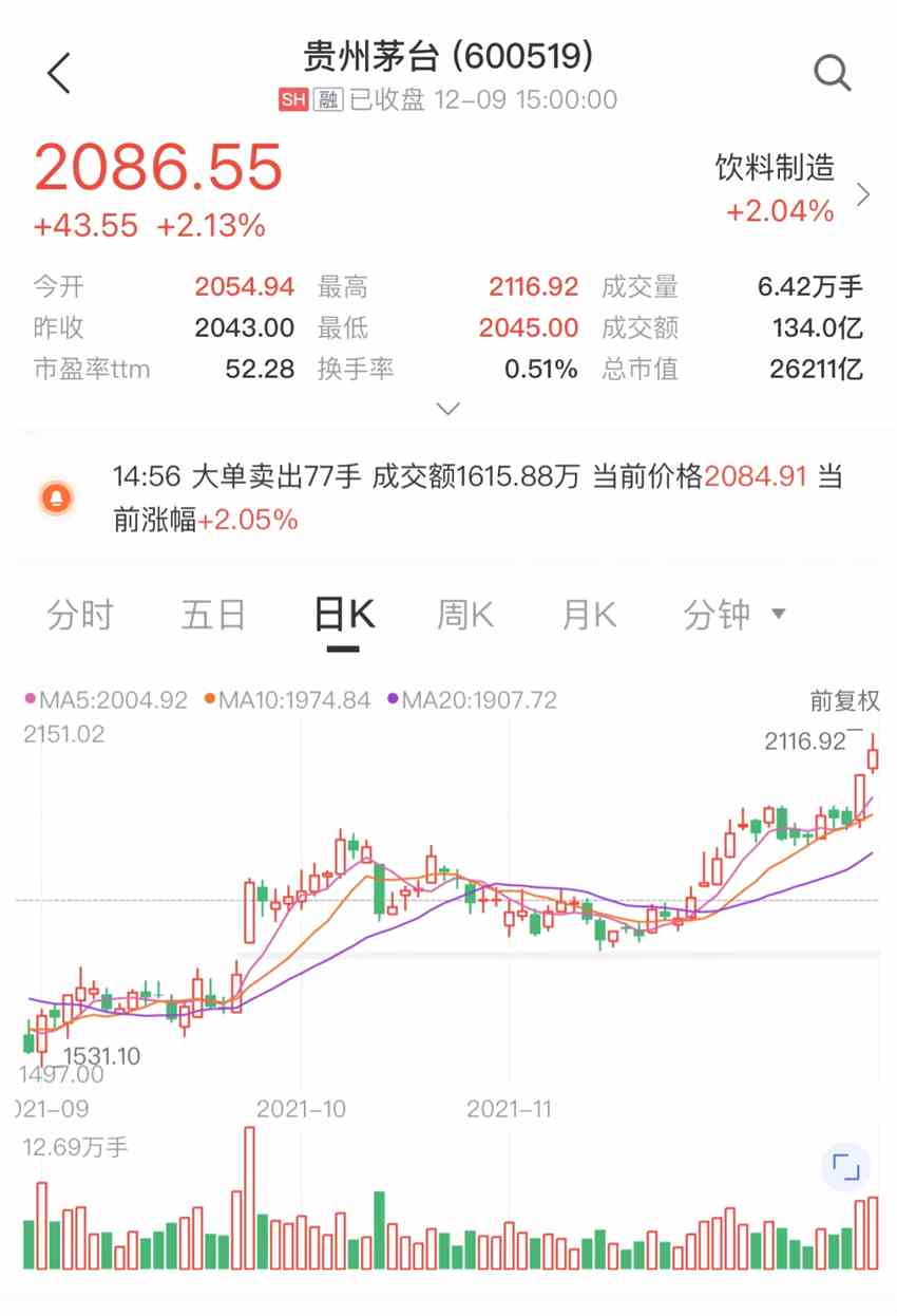 A股市值“一哥”貴州茅臺(tái)上漲2.13%。本周以來(lái),貴州茅臺(tái)累計(jì)上漲5.82%。