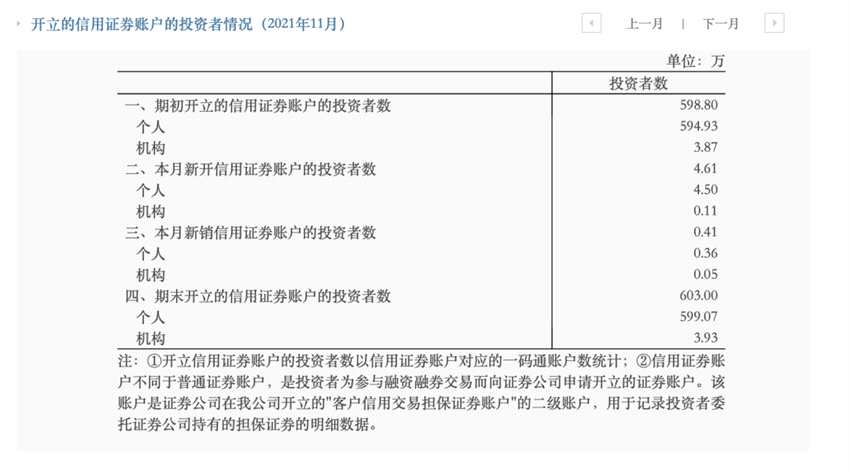 具體為,2021年11月,新開個(gè)人信用賬戶為4.50萬(wàn)個(gè),新開機(jī)構(gòu)信用賬戶數(shù)量0.11萬(wàn)個(gè)。至2021年11月末,共有603萬(wàn)個(gè)兩融賬戶投資者(個(gè)人+機(jī)構(gòu)),首次突破600萬(wàn)個(gè),較2020年末增加了約44.93萬(wàn)個(gè)。