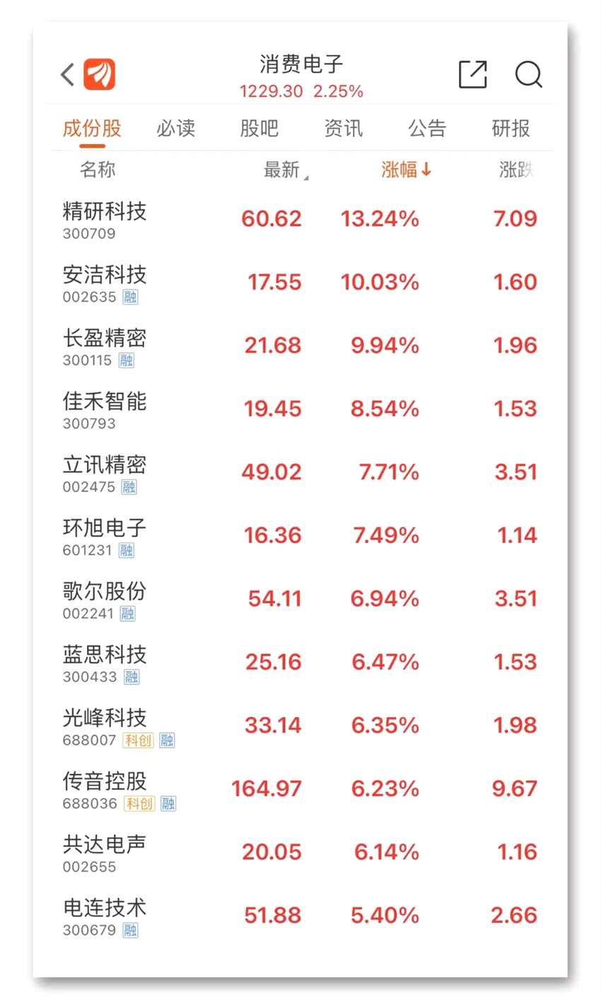 12月22日上午,消費(fèi)電子板塊表現(xiàn)活躍。板塊中,精研科技上漲13.24%,【安潔科技(002635)、股吧】、歐菲光等漲停。此外,“三劍客”歌爾股份、藍(lán)思科技、立訊精密均有較大漲幅。