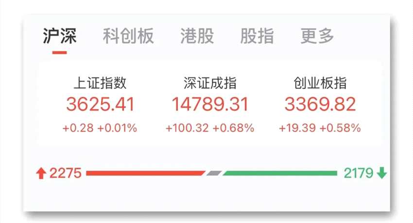 12月22日上午,A股三大指數(shù)集體上漲。上證指數(shù)漲0.01%,報(bào)3625.41點(diǎn);深證成指漲0.68%,報(bào)14789.31點(diǎn);創(chuàng)業(yè)板指漲0.58%,報(bào)3369.82點(diǎn)。