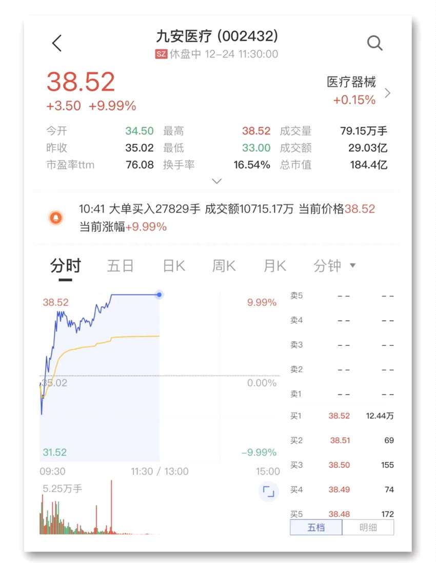 12月24日,九安醫(yī)療股價大幅低開,隨后持續(xù)高走,并且再沖漲停。截至午間收盤,其漲停依然未打開(漲9.99%),報38.52元,最新市值為184億元。本季度以來,其股價已經(jīng)累計上漲475.78%。