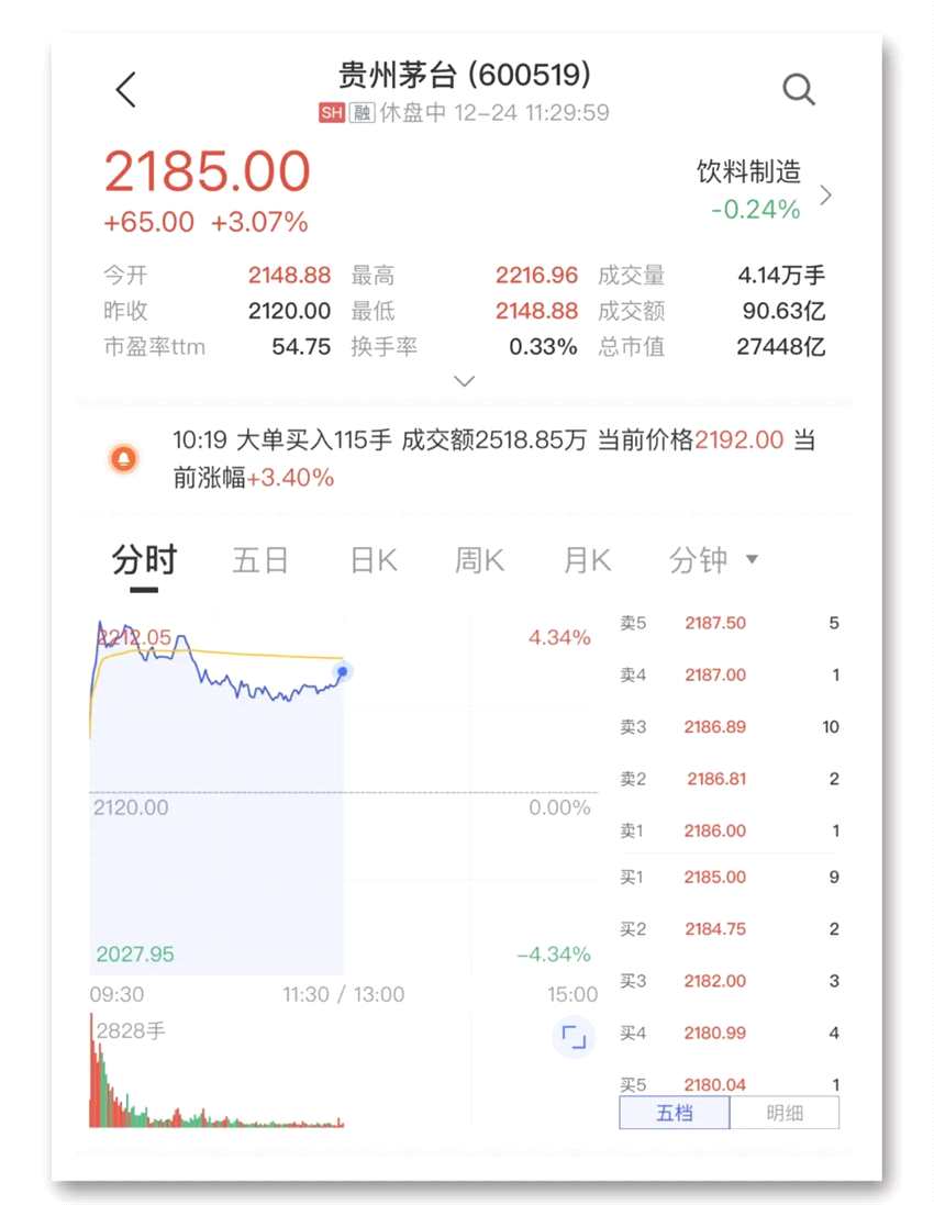 貴州茅臺盤中漲超4%,股價一度重回2200元上方。截至午間收盤,股價上漲3.07%,報2185元,最新市值為27448億元。