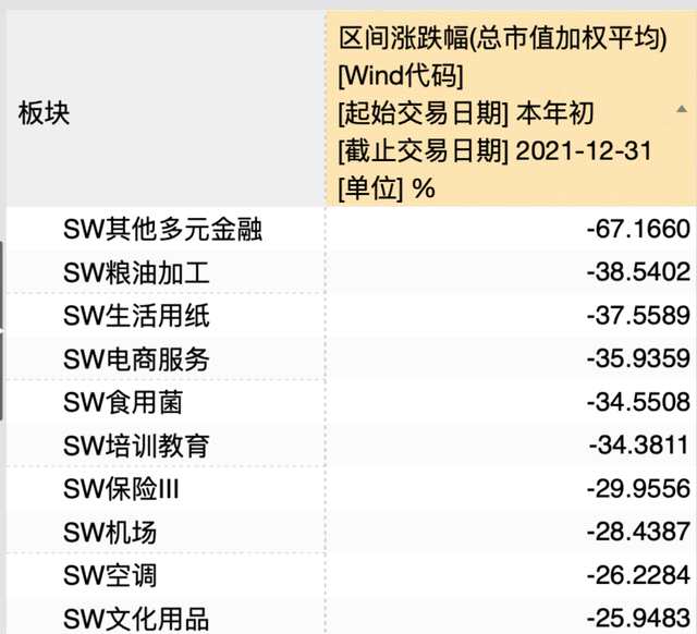 截至最新收盤日,申萬四級(jí)行業(yè)中,2021年跌幅最大的十大板塊分別是其他多元金融、糧油加工、生活用紙、電商服務(wù)、食用菌、培訓(xùn)教育、保險(xiǎn)、機(jī)場、空調(diào)以及文化用品。