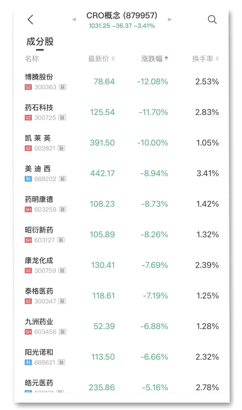 CRO板塊大跌,博騰股份(維權(quán))跌逾12%,藥石科技跌逾11%,凱萊英閃崩跌停,美迪西、藥明康德、【昭衍新藥(603127)、股吧】跌逾8%,康龍化成、泰格醫(yī)藥跌逾7%。