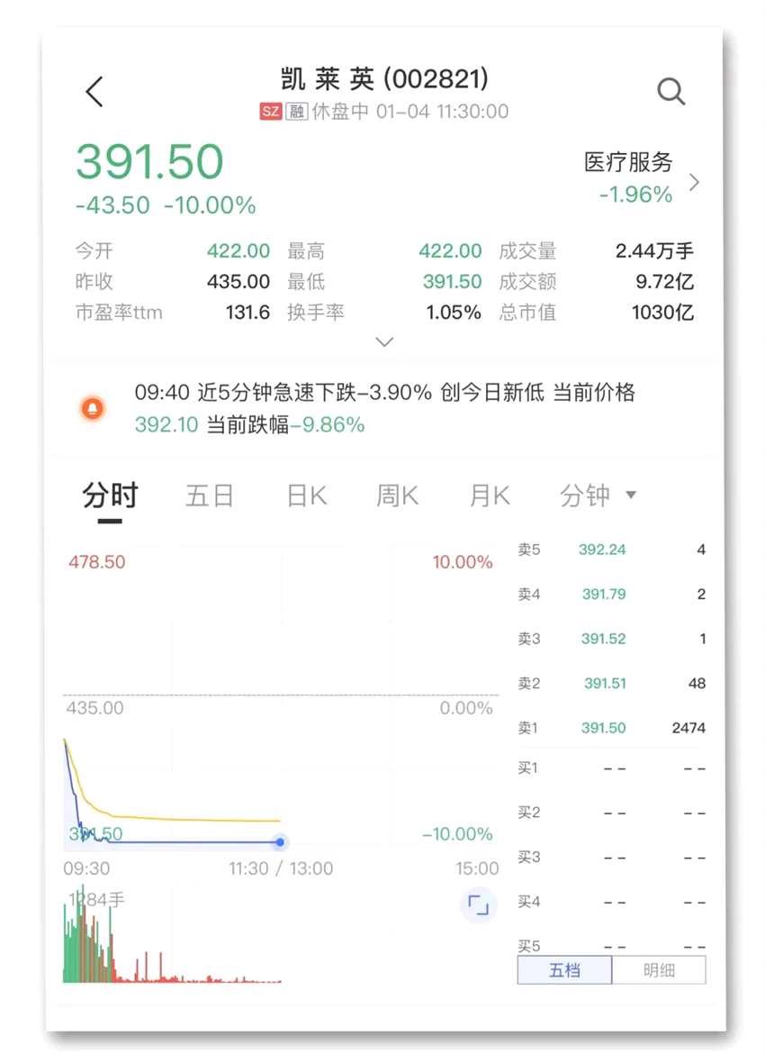 千億市值醫(yī)藥股凱萊英跌停,截至午間收盤,跌停板上的封單超過2400手,成交額為9.72億元,市值蒸發(fā)超110億元。