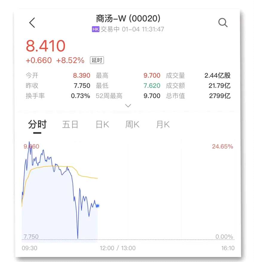 2021年12月30日,商湯-W在港股上市,上市首日上漲7.27%,之后持續(xù)大漲,12月31日漲逾30%,1月3日漲逾40%,今日,商湯-W沖高回落,盤中總市值一度突破3000億港元。
