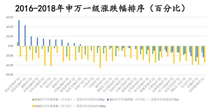 據(jù)申港證券統(tǒng)計(jì),從2015年12月美聯(lián)儲(chǔ)首次加息開(kāi)始,2016年申萬(wàn)一級(jí)行業(yè)表現(xiàn)靠前的分別是食品飲料、煤炭、建筑材料、家用電器、銀行、建筑裝飾等行業(yè)。