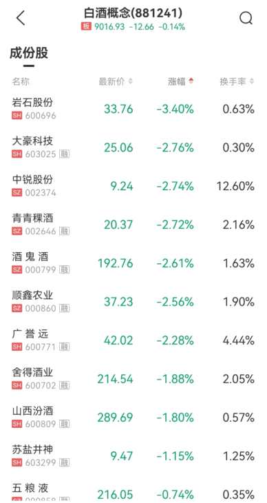 白酒概念集體下挫,青青稞酒跌超2%,酒鬼酒、順鑫農(nóng)業(yè)、【舍得酒業(yè)(600702)、股吧】等跌幅居前。