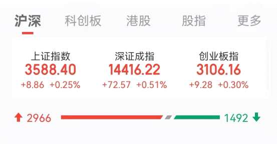 今日早盤各大指數(shù)探底回升,小幅反彈,近3000只個(gè)股上漲,醫(yī)藥生物板塊掀起漲停潮。截至午間收盤,上證指數(shù)上漲0.25%,深證成指上漲0.51%,創(chuàng)業(yè)板指上漲0.3%。