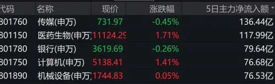 從北向資金的流向來看,5日主力凈流入額居于首位的是傳媒行業(yè),為136億元;其次是醫(yī)藥生物行業(yè),為118億元;銀行板塊的5日主力凈流入額居于行業(yè)第三位,為79億元。