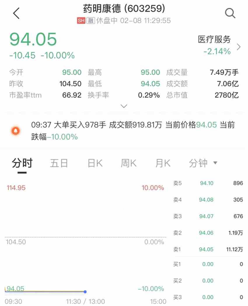 截至午間收盤,藥明康德A股跌停,跌停板上的封單為11.12萬手,成交額為7.06億元,市值蒸發(fā)約309億元,藥明康德港股下跌15.10%。