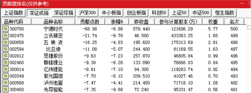 數(shù)據(jù)顯示,以貴州茅臺、藥明康德(維權(quán))、寧德時(shí)代為首的一批權(quán)重股下跌。從對創(chuàng)業(yè)板指數(shù)貢獻(xiàn)度來看,寧德時(shí)代大跌8.88%,半日市值蒸發(fā)約1200億元,對創(chuàng)業(yè)板指的貢獻(xiàn)點(diǎn)達(dá)-53.83點(diǎn),占創(chuàng)業(yè)板指下跌點(diǎn)數(shù)的4成以上。此外億緯鋰能、先導(dǎo)智能、陽光電源、東方財(cái)富等創(chuàng)業(yè)板權(quán)重股的下跌也助力創(chuàng)業(yè)板指的下跌。