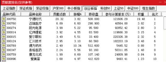 早盤(pán)對(duì)創(chuàng)業(yè)板指貢獻(xiàn)度居前股票