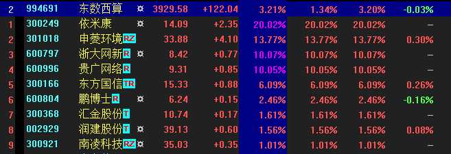 除了油氣、黃金等避險板塊走強,超級工程“東數(shù)西算”概念持續(xù)爆發(fā),逆勢上揚。具體看,依米康、首都在線均實現(xiàn)“20CM”漲停,且均為三連板,3個交易日累計漲幅超70%,浙大網(wǎng)新(維權(quán))、佳力圖、貴廣網(wǎng)絡等多股漲停。