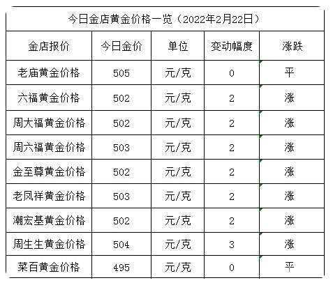 目前,金價最高的金店為老廟黃金,報價505元/克,菜百是金價最低的一家金店,報價495元/克,其他金店統(tǒng)統(tǒng)漲超500元。
