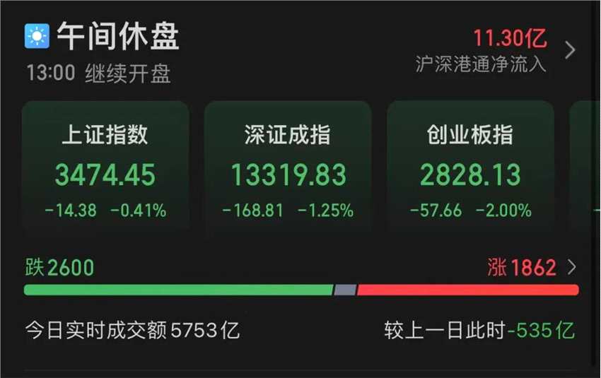 截至午間休盤,滬指下跌0.41%,報(bào)3474.45點(diǎn);深成指下跌1.25%,報(bào)13319.83點(diǎn);創(chuàng)業(yè)板指下跌2.00%,報(bào)2828.13點(diǎn)。