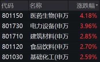 板塊方面,申萬(wàn)一級(jí)行業(yè)分類(lèi)下的31個(gè)板塊,有30個(gè)實(shí)現(xiàn)上漲。其中,醫(yī)藥生物大漲4.18%領(lǐng)漲兩市,電力設(shè)備緊隨其后漲3.96%,建筑材料、食品醫(yī)療等均漲超2%,僅農(nóng)林牧漁微跌0.22%。