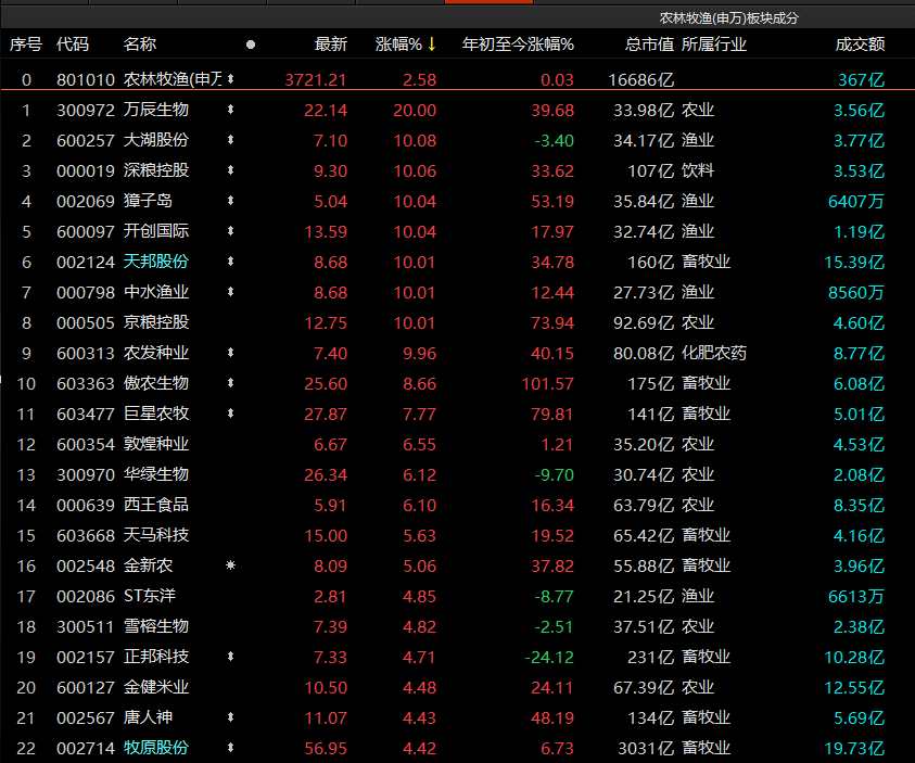 31個(gè)申萬一級(jí)行業(yè)來看,農(nóng)林牧漁以2.58%漲幅領(lǐng)漲,【天邦股份(002124)、股吧】等10只個(gè)股漲停,行業(yè)龍頭牧原股份漲幅超過4%。該板塊近期持續(xù)抬頭,其年內(nèi)漲幅由跌轉(zhuǎn)為微漲。