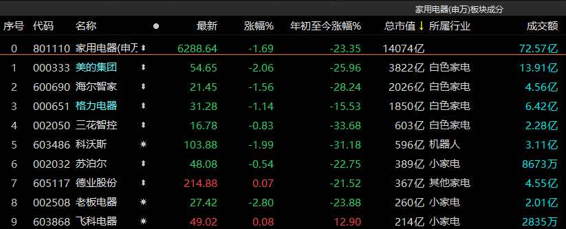 與電子板塊成為難兄難弟的還有家用電器概念,今日跌近2%,近5日跌逾5%,年內(nèi)跌幅超過23%。美的集團(tuán)、海爾智家、格力電器今日全部收跌,年內(nèi)走勢(shì)低迷。