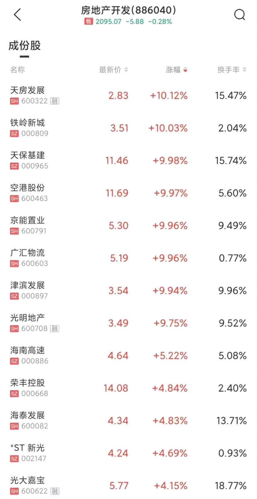 房地產(chǎn)開發(fā)板塊回暖,天房發(fā)展、天?;?、空港股份、津?yàn)I發(fā)展、廣匯物流、鐵嶺新城漲停,光大嘉寶、京能置業(yè)、臥龍地產(chǎn)等跟漲。其中,空港股份開盤下跌近6%,后拉升漲停,盤中上漲近16%。