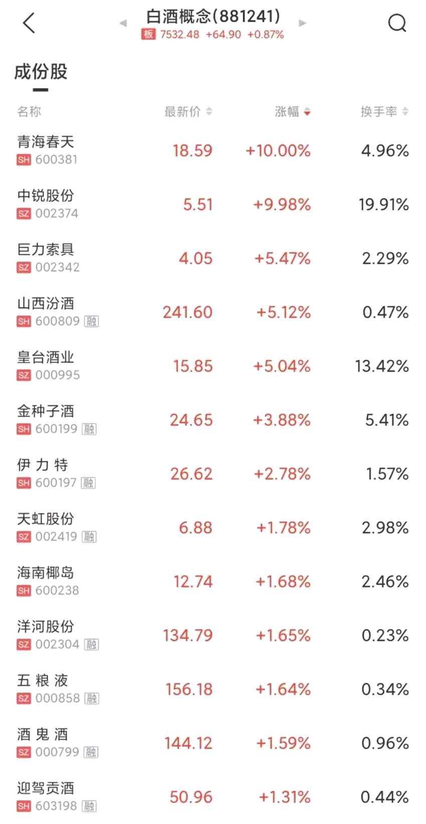 4月12日,受龍頭酒企基本面繼續(xù)強(qiáng)勢(shì)消息影響,A股白酒概念震蕩反彈。截至中午收盤,青海春天、中銳股份漲停,皇臺(tái)酒業(yè)(維權(quán))、山西汾酒、金種子酒、伊力特、酒鬼酒、舍得酒業(yè)、五糧液、洋河股份等股拉升上漲。