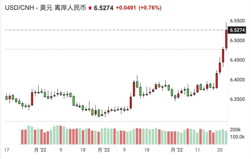 4月19日開(kāi)始,在岸、離岸人民幣連續(xù)四天對(duì)美元貶值,累計(jì)貶值幅度分別高達(dá)近1400點(diǎn)和1500點(diǎn),貶值幅度超2%,觸及2021年11月以來(lái)的低點(diǎn),單周跌幅也為自2019年8月以來(lái)的最大跌幅。在上周五(4月22日),一向克制的在岸人民幣更是大跌500點(diǎn),跌幅超出了離岸。4月25日,中國(guó)a股、人民幣繼續(xù)大幅下挫,離岸人民幣一度逼近6.6大關(guān),五天累計(jì)跌幅高達(dá)近2000點(diǎn),上證綜指也跌破了3000點(diǎn)。