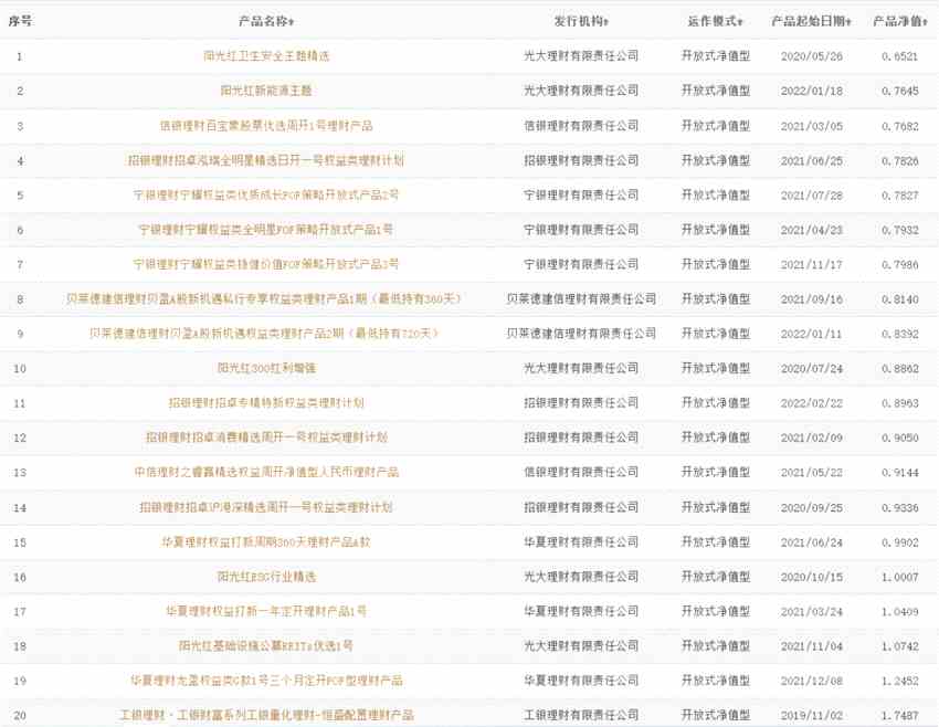 中國(guó)理財(cái)網(wǎng)最新數(shù)據(jù)顯示,受資本市場(chǎng)波動(dòng)等多因素影響,市面上存續(xù)的119只權(quán)益類(lèi)理財(cái)產(chǎn)品中有37只產(chǎn)品凈值跌破1,占比達(dá)31.09%。其中,由銀行理財(cái)公司管理的產(chǎn)品有20只,有15只產(chǎn)品凈值跌破1,7只產(chǎn)品浮虧已超過(guò)20%,管理人包括光大理財(cái)、信銀理財(cái)、招銀理財(cái)、寧銀理財(cái)?shù)取?/p>