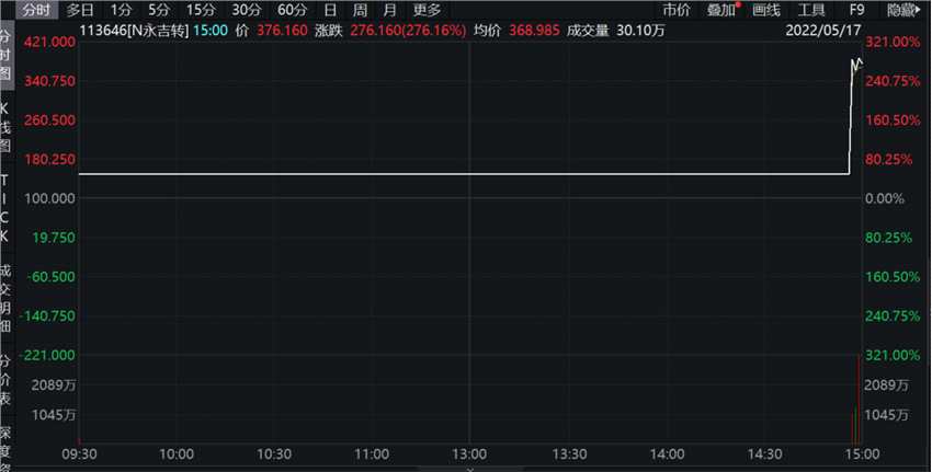 5月17日上市的永吉轉(zhuǎn)債暴漲276%,刷新了歷史。