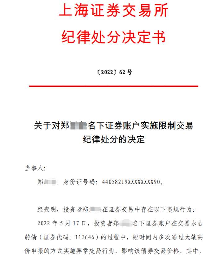 基于鄭某某的違規(guī)事實(shí)和情節(jié),上交所最終對其做出紀(jì)律處分決定:自2022年5月23日至2022年8月22日對鄭澤堅(jiān)名下的相關(guān)證券賬戶實(shí)施限制交易的紀(jì)律處分,即不得買入和賣出在本所掛牌交易的所有債券。對于該紀(jì)律處分決定,上交將通報(bào)證監(jiān)會(huì),并記入證券期貨市場誠信檔案。