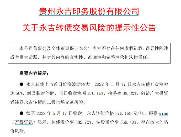 回顧永吉轉(zhuǎn)債的市場表現(xiàn),5月17日,永吉轉(zhuǎn)債以150元頂格開盤,觸及臨時(shí)停牌機(jī)制;臨近收盤前最后3分鐘復(fù)牌再度暴漲,當(dāng)期收盤價(jià)格達(dá)到376.16元/張,漲幅276.16%,換手率達(dá)到39.82%。
