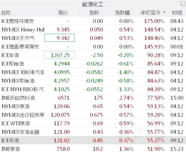 目前,布油交易于120美元上方,美油與布油傳統(tǒng)的差價不復存在。其他傳統(tǒng)能源如煤炭和天然氣,交易價格年初至今漲幅大多已經(jīng)翻倍。