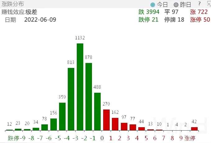 連續(xù)收紅7天后,6月9日,A股出現(xiàn)調(diào)整,三大指數(shù)皆收跌,其中創(chuàng)業(yè)板指數(shù)收跌將近3%。兩市只有722家公司上漲,漲停家數(shù)下降至50家,情緒退潮較為明顯。