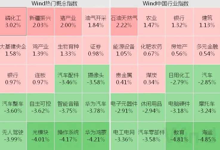 具體板塊方面,磷化工、石油、煤炭、天然氣、金融、建筑、農(nóng)業(yè)、房地產(chǎn)等全天強(qiáng)勢(shì),而海運(yùn)與科技板塊低迷。