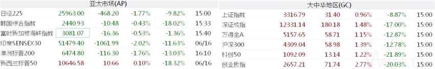 6月17日,亞太股市收盤全線下跌,韓國綜合指數(shù)跌0.43%,本周跌5.97%。日經(jīng)225指數(shù)跌1.77%,本周跌6.69%。澳洲標(biāo)普200指數(shù)跌1.76%,本周跌6.6%。新西蘭NZX50指數(shù)跌0.54%,本周跌4.91%。