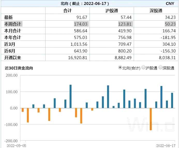北向資金依舊大幅凈流入A股市場,6月累計加倉已近600億元。6月17日,全天再度大幅凈買入91.68億元,其中滬股通凈買入57.45億元,深股通凈買入34.23億元。本周北向資金累計凈買入174億元。