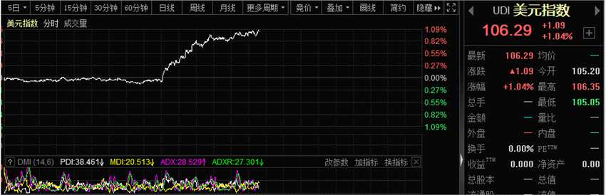 受此影響,美元指數(shù)一頓狂拉。美元指數(shù)日內(nèi)漲幅一度達到1.1%,亦創(chuàng)20年新高,最高一度達106.33,后續(xù)可能還有新高。