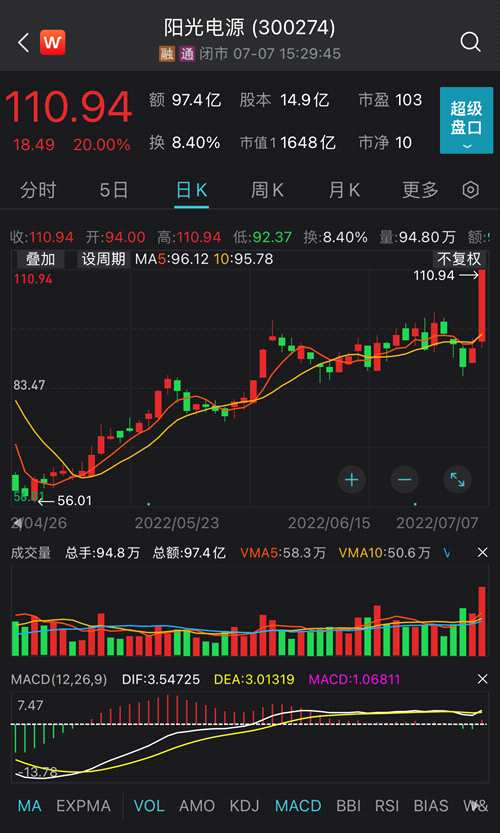 7月7日,A股小幅反彈,新能源賽道繼續(xù)火爆,汽車板塊大幅拉升,光伏逆變器龍頭陽(yáng)光電源20CM漲停。