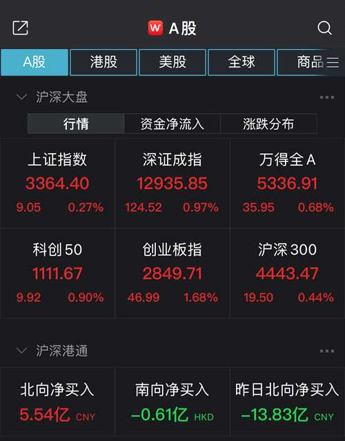 上證指數(shù)收漲0.27%報(bào)3364.40點(diǎn);深成指漲0.97%報(bào)12935.85點(diǎn);創(chuàng)業(yè)板指漲1.68%報(bào)2849.71點(diǎn),萬(wàn)得全A總成交1.05萬(wàn)億。