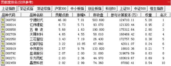 圖片來源:Wind 從對指數(shù)貢獻度來看,寧德時代的大漲對深證成指和創(chuàng)業(yè)板指的助推功不可沒。通達信數(shù)據(jù)顯示,對深證成指貢獻度居前的股票為寧德時代、億緯鋰能、五糧液;對創(chuàng)業(yè)板指貢獻度居前的股票為寧德時代、億緯鋰能、億聯(lián)網(wǎng)絡。其中寧德時代對創(chuàng)業(yè)板指的指數(shù)貢獻點位達35.64點,占今日創(chuàng)業(yè)板指上漲點數(shù)44.17點的8成以上。今日寧德時代成交額為129.3億元,高居A股第一,市值增長862億元。