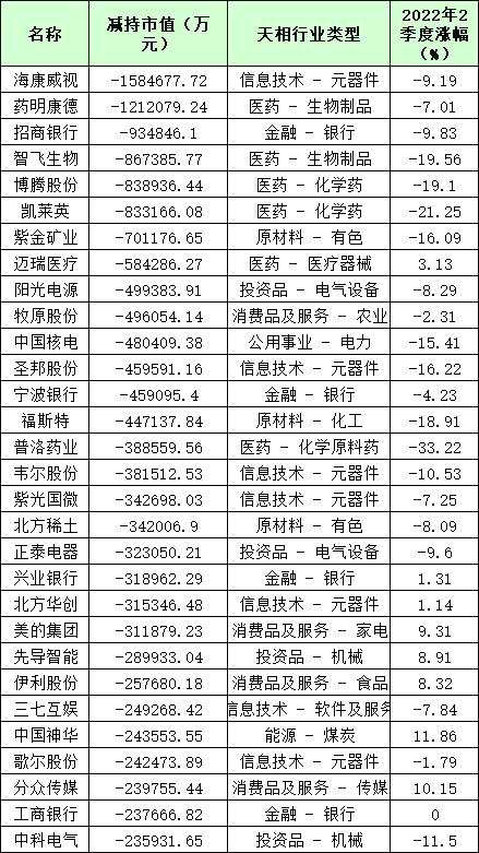 基金二季度末重倉的前30個(gè)股,來源:天相投顧基金二季度末重倉的前30個(gè)股,來源:天相投顧  另一方面,從減持情況看,截至二季度末,積極投資偏股型基金合計(jì)減持市值最多的三只個(gè)股是,??低?、藥明康德、招商銀行,減持市值分別達(dá)158.47億元、121.21億元和93.48億元;智飛生物(300122.SZ)、博騰股份(維權(quán))(300363.SZ)、凱萊英(002821.SZ)、紫金礦業(yè)(601899.SH)均獲減持超70億元。
