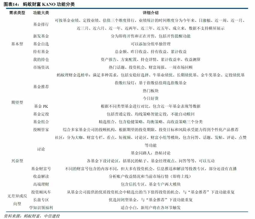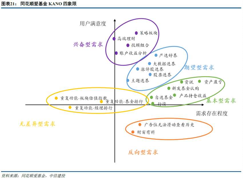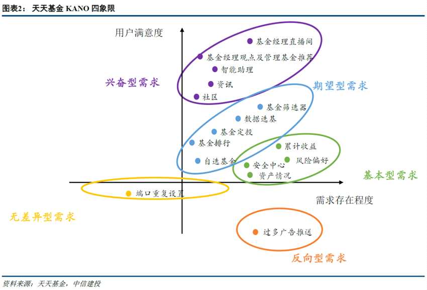 基金銷售APP為投資者提供了集基金交易、投顧服務(wù)、產(chǎn)品比較、社區(qū)討論、學(xué)習(xí)理財?shù)葹橐惑w的功能平臺。從商業(yè)模式看,在線基金銷售不過是流量聚集再分發(fā)的變現(xiàn),自有基金代銷以來,諸多公司都曾布局過線上場景,模式表面類似的情況下發(fā)展方向大相徑庭。因此,我們猜想線上銷售的能力一定有其獨特壁壘,以傳統(tǒng)投研思維去分析恐怕難以深入,所以我們采用KANO模型對保有量排名較為靠前的2C互聯(lián)網(wǎng)代銷平臺進行對比。