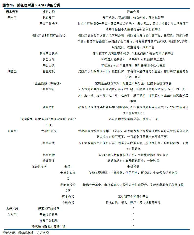 功能特性上:天天基金對用戶期望型和興奮型需求滿足程度最高,螞蟻財富期望型占優(yōu),理財通各項均衡但豐富度不足,愛基金以基本型和期望型為主,且慢對興奮型需求滿足程度較高。1)天天基金:需求滿足程度均衡且完善,期望型和興奮型功能豐富;2)螞蟻財富:期望型功能占優(yōu),更好的滿足了特定人群的特定需求;3)騰訊理財通:基本型、期望型、興奮型功能占比均衡,但豐富度略顯不足;3)同花順愛基金:側(cè)重于提高興奮型需求的滿足程度,但目前仍以基本型和期望型為主;4)且慢:興奮型需求滿足程度最高,極致簡潔突出投顧交互。