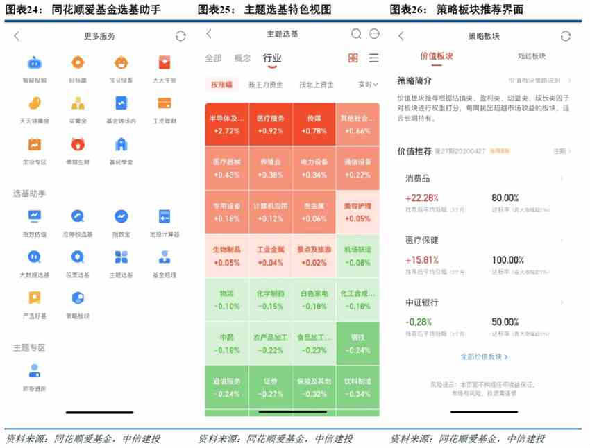 產(chǎn)品調(diào)性上,天天基金更像綜合平臺,螞蟻財富類似產(chǎn)品超市,理財通主打余額管理,愛基金優(yōu)先做策略工具,且慢的特點是便利化投顧服務(wù)。1)天天基金:功能齊全,主打綜合性理財平臺,綜合需求分類和產(chǎn)品分類,對標(biāo)較成熟投資者。2)螞蟻財富:類似產(chǎn)品超市,依托于支付寶流量,營造了氛圍良好的小白理財社區(qū),同時也逐步提高老用戶的使用黏性。3)騰訊理財通:作為主打余額管理,以簡潔的交互和標(biāo)簽化的推薦為各類用戶打造輕松便捷的投資體驗。4)同花順愛基金:側(cè)重?fù)窕瑯O致優(yōu)化策略選基。5)且慢:作為近年來基金投顧的后起之秀,憑借“AI+人工”的全過程投顧服務(wù)取得投資者深度信賴,在興奮型功能方面展現(xiàn)出獨特優(yōu)勢。